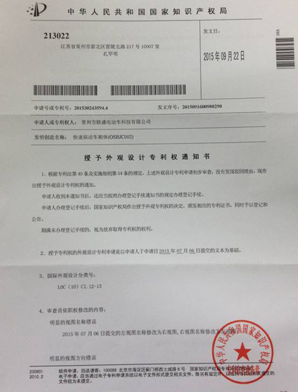 外觀設計專利權通知書